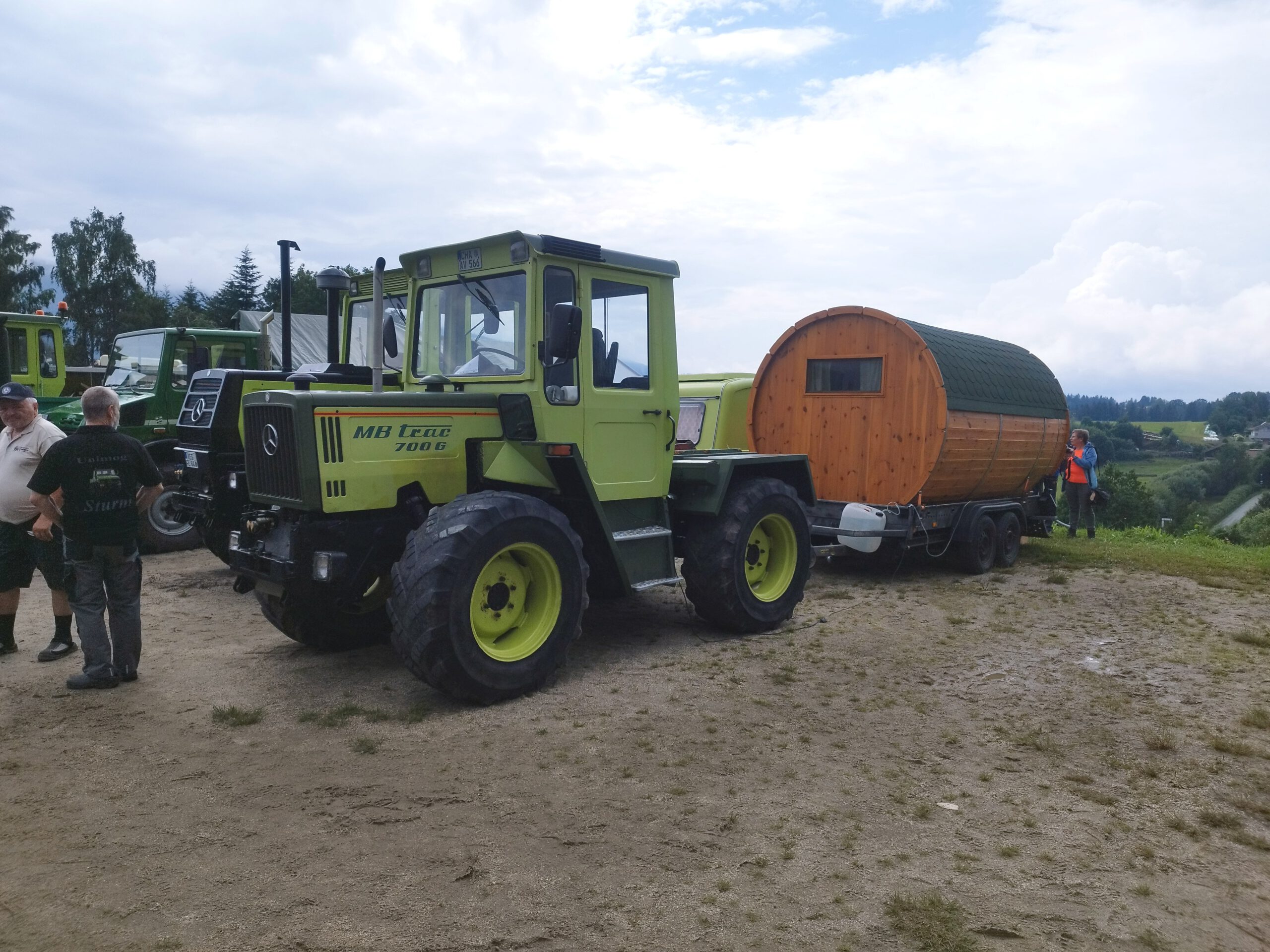 Der älteste aktive Unimogler beim Treffen war Franz Hackl. Der frühere Holzhändler, heute 86, setzt seinen U 421 Baujahr 1978 mit Kranaufsatz nach wie vor im Privatwald ein. Unter den Teilnehmern war auch Bürgermeister Franz Müller, Besitzer von zwei Unimog, und dieses Mal mit einem orangefarbenen U 418 vor Ort. Auffällig war das von einem MB-trac gezogene Saunafass, das Anton Vogl zum Übernachtungsplatz umgebaut hat. Willi Freimuth tuckerte mit seinem 411er nach Lohberg und hatte eine „Küche“ stilvoll mit Wanduhr und Holzofen eingerichtet. Ein Kuriosum war, dass ein Ehepaar aus Wolfratshausen ihren Hochzeits-Unimog wiederentdeckte. Dieser rote Gigant gehört nun Sägewerker Helmut Ertl und ist im Unternehmen und im Winterdienst im Einsatz. Für Staunen sorgte außerdem ein Berliner Kennzeichen. Oliver und Christoph Drong hatten die Idee, ihren U 406 mit Doppelkabine (einen ehemaliger Flugzeugschlepper) auf einen Tieflader zu packen und damit bis in den Bayerischen Wald zu fahren…